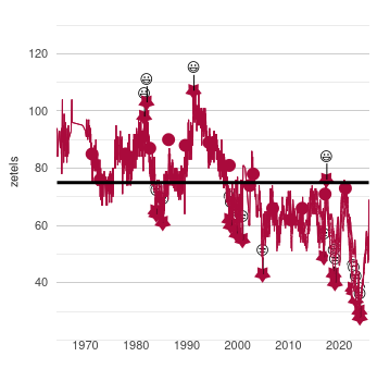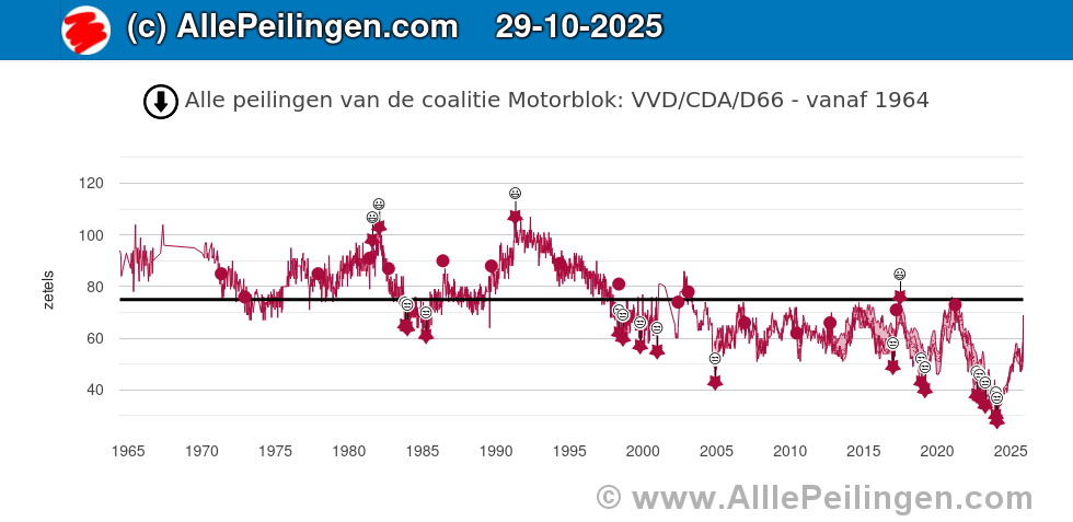 In een historische grafiek worden de zeven verschillende peilingen voor de coalitie VVD / CDA / D66 (Motorblok) vanaf 1964 tot nu met elkaar vergeleken. Hierbij wordt gebruik gemaakt van peilingen van de volgende peilers: peil.nl van Maurice de Hond, Verian, de politieke barometer van Ipsos Synovate, I&O Research, De Stemming, LISS panel en NOS Peilingwijzer.