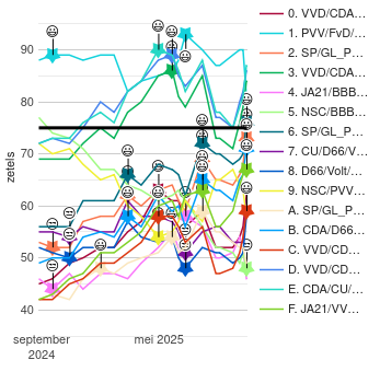 Diverse coalitie mogelijkheden - van rechts via Kunduz en paars naar links - van de afgelopen twee jaar uitgevoerd door Verian worden in een grafiek vergeleken.