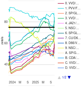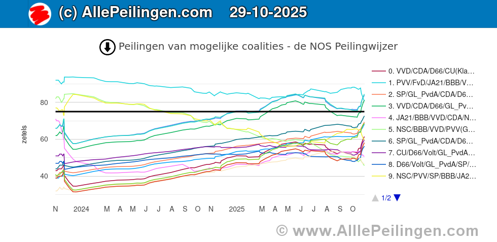 Diverse coalitie mogelijkheden - van rechts via Kunduz en paars naar links - van de afgelopen twee jaar uitgevoerd door NOS Peilingwijzer gemaakt door Tom Louwerse van de universiteit Leiden worden in een grafiek vergeleken.