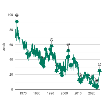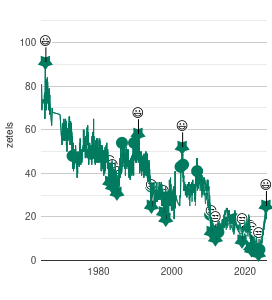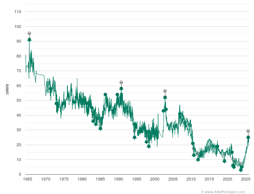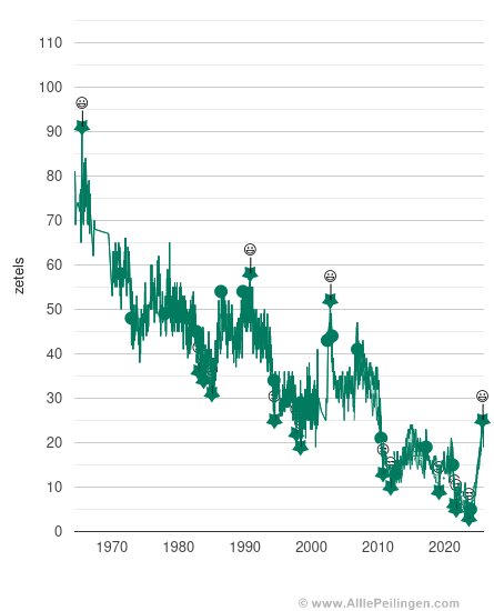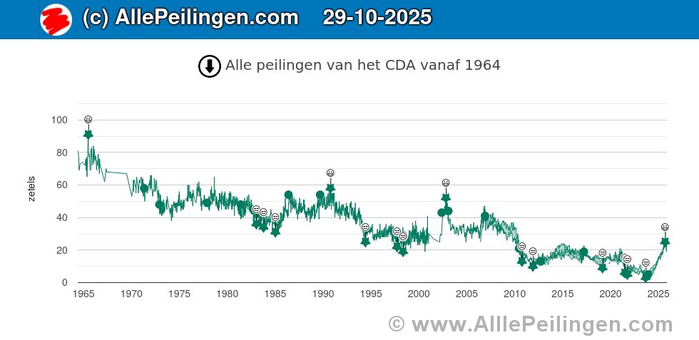 In een historische grafiek worden de zeven verschillende peilingen voor de CDA vanaf 1964 tot nu met elkaar vergeleken. Het CDA is in 1980 ontstaan uit een fusie van de partijen: ARP, CHU en KVP. Hierbij wordt gebruik gemaakt van peilingen van de volgende peilers: peil.nl van Maurice de Hond, Verian, de politieke barometer van Ipsos Synovate, I&O Research, De Stemming, LISS panel en NOS Peilingwijzer.