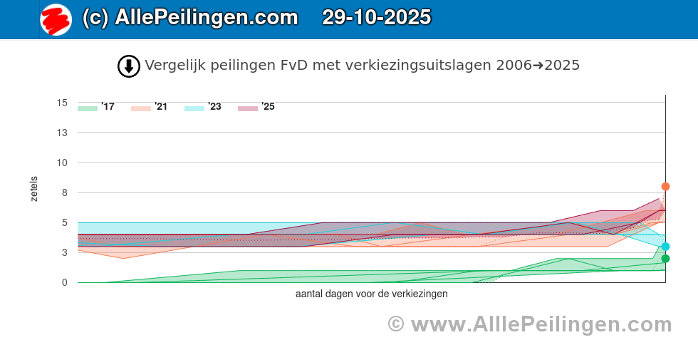 In een grafiek worden de zeven verschillende peilingen voor de FvD van de laatste drie maanden voorafgaande aan de verkiezingen van 2006, 2010, 2012, 2017, 2021, 2023 en 2025 met elkaar vergeleken. Er valt te zien welke partij structureel worden onderschat en overschat. Er wordt gebruik gemaakt van peilingen van de volgende peilers: peil.nl van Maurice de Hond, Verian, de politieke barometer van Ipsos Synovate, I&O Research, De Stemming, LISS panel en NOS Peilingwijzer.