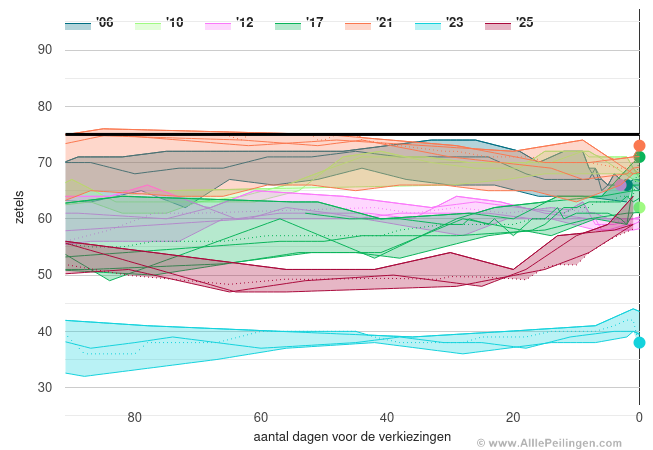 In een grafiek worden de zeven verschillende peilingen voor de coalitie VVD / CDA / D66 (Motorblok) van de laatste drie maanden voorafgaande aan de verkiezingen van 2006, 2010, 2012, 2017, 2021, 2023 en 2025 met elkaar vergeleken. Er valt te zien welke of deze coalitie structureel worden onderschat of overschat. Er wordt gebruik gemaakt van peilingen van de volgende peilers: peil.nl van Maurice de Hond, Verian, de politieke barometer van Ipsos Synovate, I&O Research, De Stemming, LISS panel en NOS Peilingwijzer.